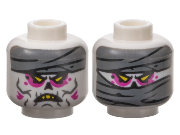 Minifigure, Head Dual Sided Alien Dark Bluish Gray Mummy Wrappings, Yellow Triangular Eyes, Magenta Eye Shadow, Open Mouth Scowl with Top Teeth / Wrapped Lower Face Pattern