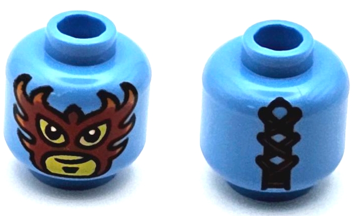 Minifigure, Head Balaclava with Yellow Face, Black Soul Patch, Lopsided Grin, Wrestling Mask with Red and Orange Flames, Laces on Back Pattern