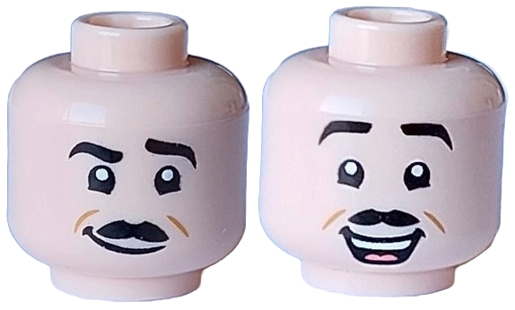 Minifigure, Head Dual Sided Black Eyebrows, Narrow Moustache, Medium Nougat Cheek Dimples, Lopsided Grin / Open Mouth Smile with Top Teeth and Coral Tongue Pattern
