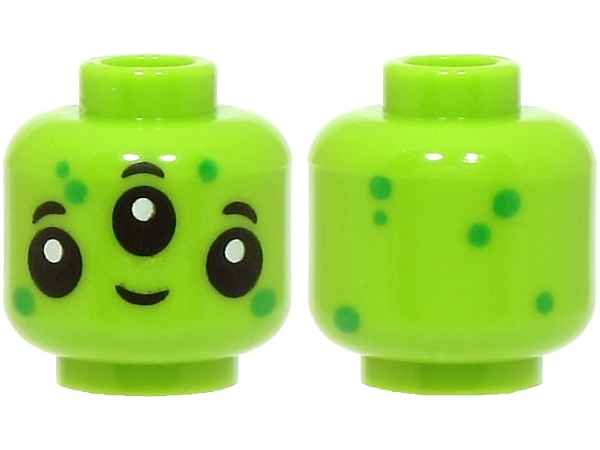 Minifigure, Head Alien with 3 Black Eyes and Eyebrows, Bright Green Dots, Grin Pattern