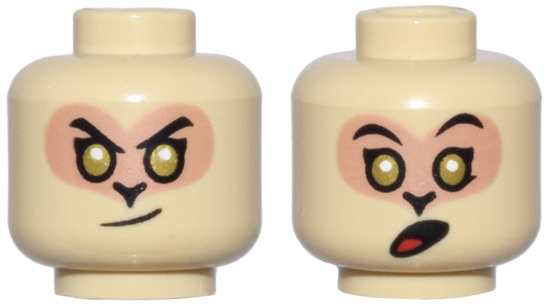 Minifigure, Head Dual Sided Alien Black Eyebrows, Gold Eyes, Nougat Face, Smirk / Surprised Open Mouth with Red Tongue Pattern