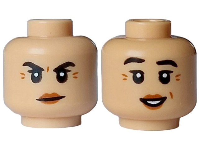 Minifigure, Head Dual Sided Female Black Eyebrows Raised, Dark Orange Wrinkles and Lips, Mouth Closed Angry / Open Smile with White Teeth Pattern