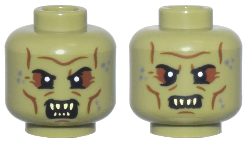 Minifigure, Head Dual Sided Alien Orc Reddish Brown Wrinkles, Dark Bluish Gray Spots, Pointed Top and Bottom Teeth / Top Teeth Pattern