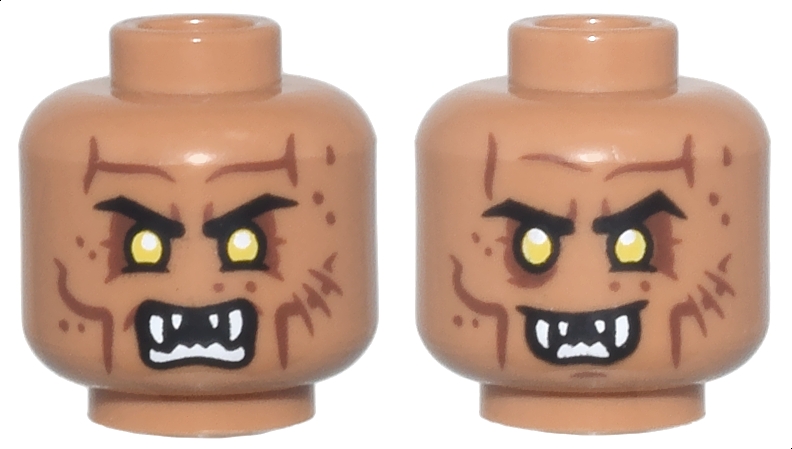 Minifigure, Head Dual Sided Alien Orc Yellow Eyes, Reddish Brown Wrinkles and Scars, Pointed White Teeth, Grimace / Grin Pattern