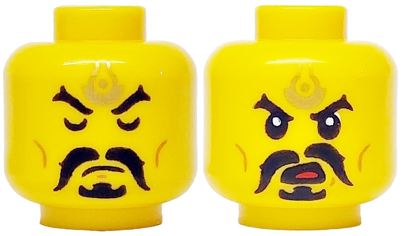 Minifigure, Head Dual Sided Black Eyebrows, Moustache and Goatee, Gold Forehead Tattoo, Medium Nougat Cheek Lines, Eyes Closed / Eyes and Mouth Open with Red Tongue Pattern