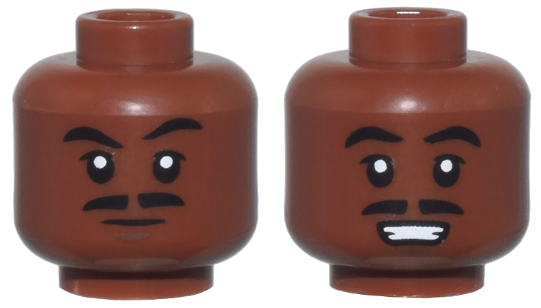 Minifigure, Head Dual Sided Black Eyebrows, Upper Eyelids, and Split Moustache, Dark Brown Chin Dimple, Neutral / Open Mouth Smile with Teeth Pattern