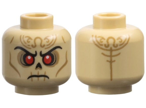 Minifigure, Head Alien Skull with Black Eyebrows, Nose and Mouth, Red Eyes, Dark Tan Filigree Tattoos and Contours, Frown Pattern