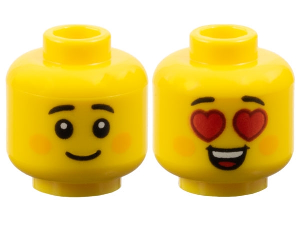 Minifigure, Head Dual Sided Child Black Small Eyebrows, Bright Light Orange Circles on Cheeks, Grin / Red Heart Eyes and Open Mouth Smile with Top Teeth and Tongue Pattern
