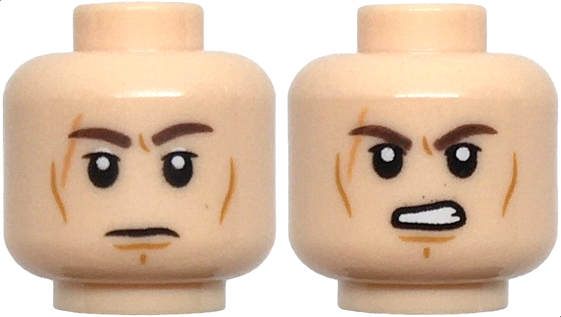 Minifigure, Head Dual Sided Dark Brown Eyebrows, Upper Eyelids, Nougat Scar, Medium Nougat Cheek Lines and Chin Dimple, Neutral / Angry Open Mouth Scowl with Teeth Pattern
