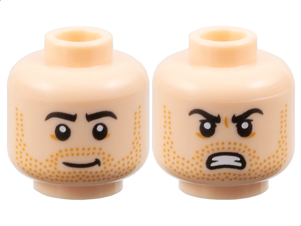Minifigure, Head Dual Sided Black Eyebrows, Medium Nougat Beard Stubble, Slightly Lopsided Grin / Angry Bared Teeth and Upper Eyelids Pattern