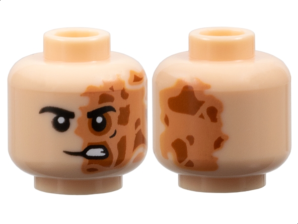 Minifigure, Head Black Eyebrows, Nougat and Dark Orange Burned and Scarred Left Side, Lopsided Open Mouth Scowl with Teeth Pattern