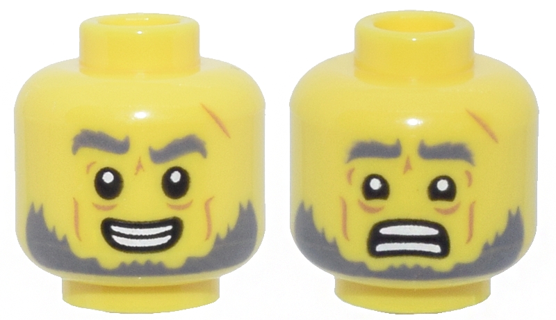Minifigure, Head Dual Sided Dark Bluish Gray Bushy Eyebrows and Beard, Medium Nougat Cheek Lines, Wrinkles and Scar, Open Mouth Smile with Teeth Parted / Scared Pattern