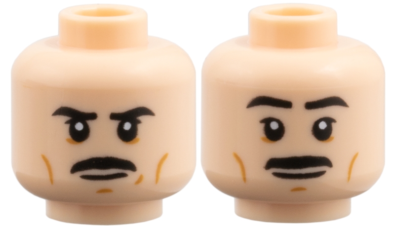 Minifigure, Head Dual Sided Black Eyebrows and Moustache, Upper Eyelids, Medium Nougat Cheek Lines, Chin Dimple and Wrinkles, Stern / Slight Grin Pattern