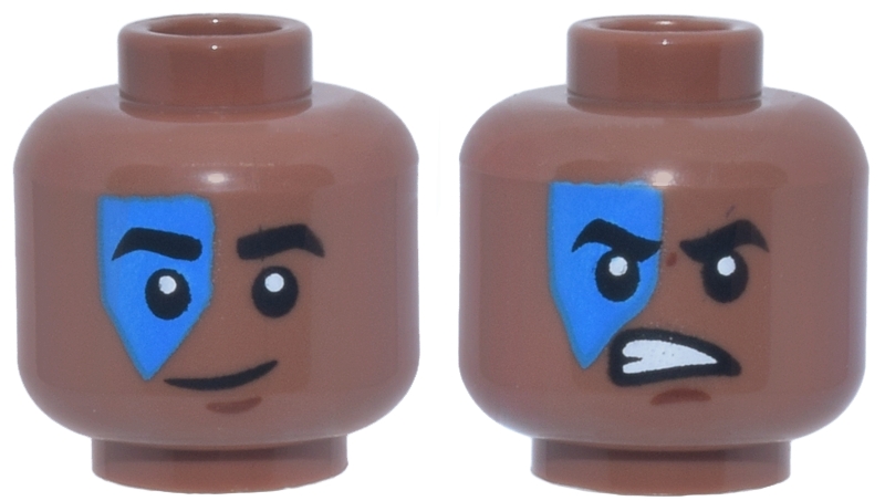 Minifigure, Head Dual Sided Thick Black Eyebrows, Blue Face Paint, Reddish Brown Chin Dimple, Lopsided Grin / Open Mouth Scowl with Teeth Pattern