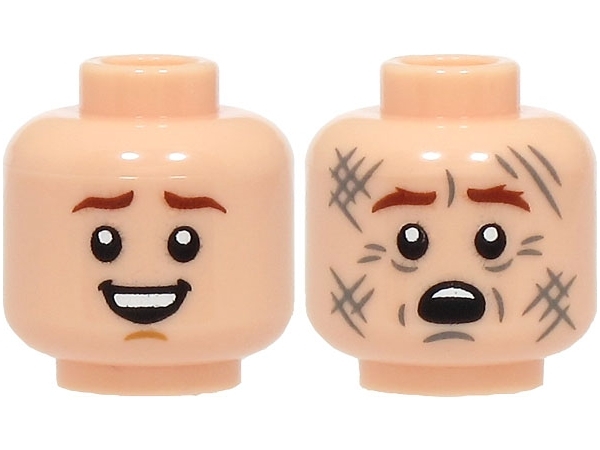 Minifigure, Head Dual Sided Reddish Brown Eyebrows, Medium Nougat Chin Dimple, Open Mouth Smile with Top Teeth / Scared with Dark Bluish Gray Scuff Marks Pattern