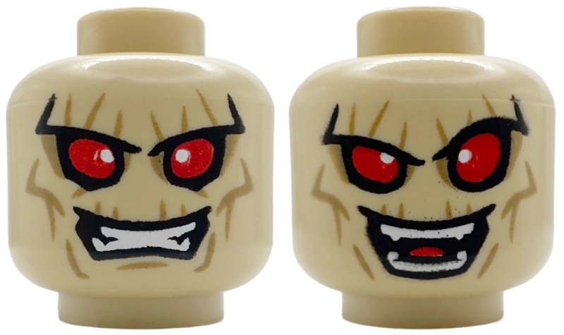 Minifigure, Head Dual Sided Alien with Red Eyes, White Glints, Dark Tan Wrinkles, Clenched Teeth / Open Mouth Grin Pattern