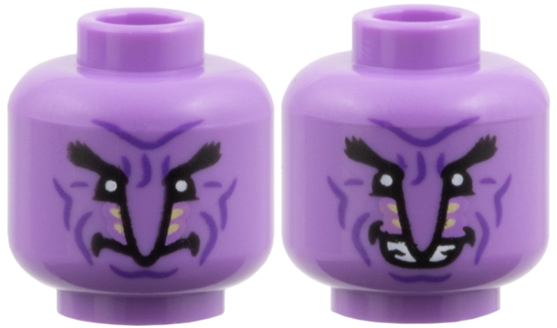 Minifigure, Head Dual Sided Alien, Black Eyebrows, Dark Purple Contour Lines, Long Nose, Tan Stripes, Neutral / Smile with Teeth Pattern