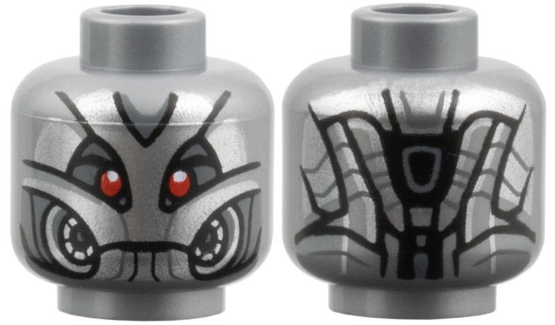 Minifigure, Head Alien Robot with Silver Face with Dark Bluish Gray Lines, Red Eyes, Armor Panels on Back Pattern