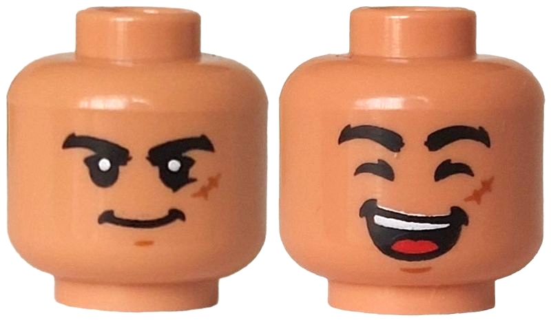 Minifigure, Head Dual Sided Black Eyebrows, Dark Orange Scar and Chin Dimple, Closed Mouth Grin / Open Mouth Smile, Red Tongue, White Teeth, Closed Eyes Pattern
