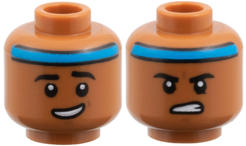 Minifigure, Head Dual Sided Dark Azure Headband, Black Eyebrows, Lopsided Open Mouth Grin / Firm Gritted Teeth Pattern