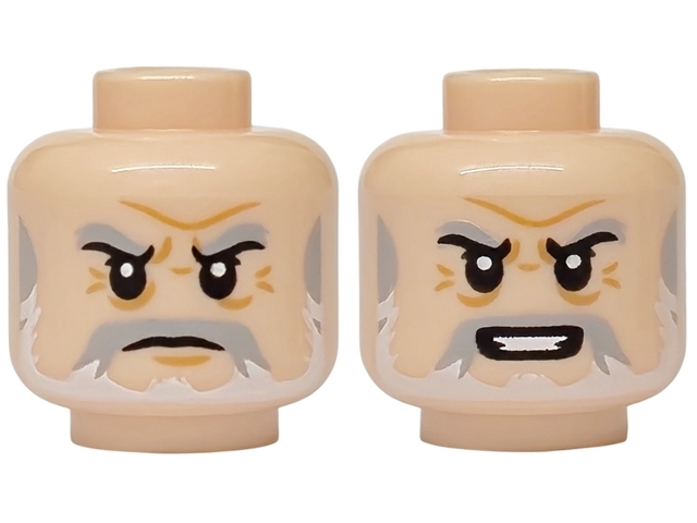 Minifigure, Head Dual Sided Light Bluish Gray Eyebrows and Moustache, White Beard, Medium Nougat Chin Dimple, Forehead Crease and Crow's Feet, Frown / Open Mouth Scowl with Teeth Pattern