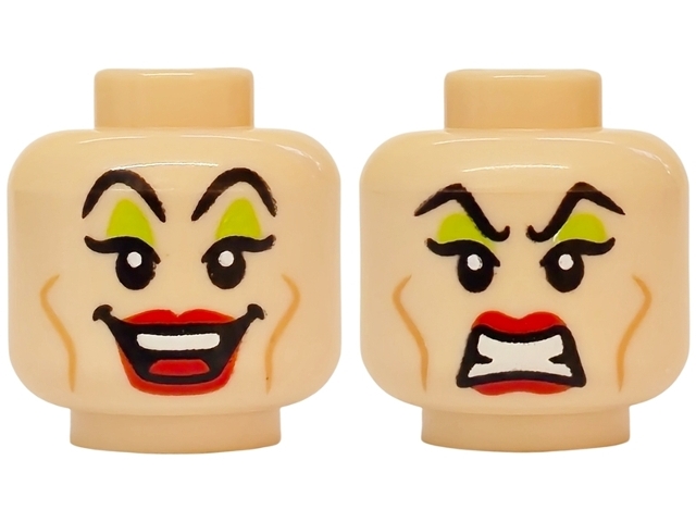 Minifigure, Head Dual Sided Female Black Eyebrows, Lime Eye Shadow, Medium Nougat Cheek Lines, Red Lips, Open Mouth Smile with Tongue and Top Teeth / Angry Scowl Pattern