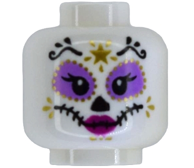 Minifigure, Head Alien Female La Catrina with Black Eyebrows, Triangular Nose, Stitched Mouth, Medium Lavender Eye Shadow, Magenta Lips, Gold Face Paint with Star Pattern (BAM)