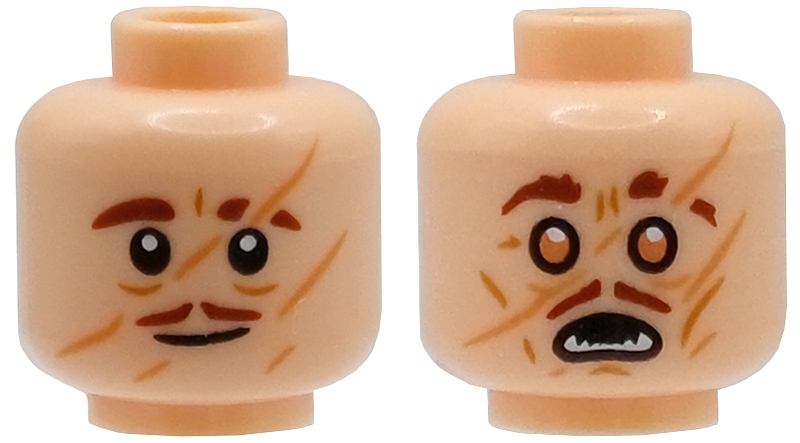 Minifigure, Head Dual Sided Reddish Brown Eyebrows and Moustache, Medium Nougat Slash Scars, Neutral / Medium Nougat Eyes and White Fangs Pattern