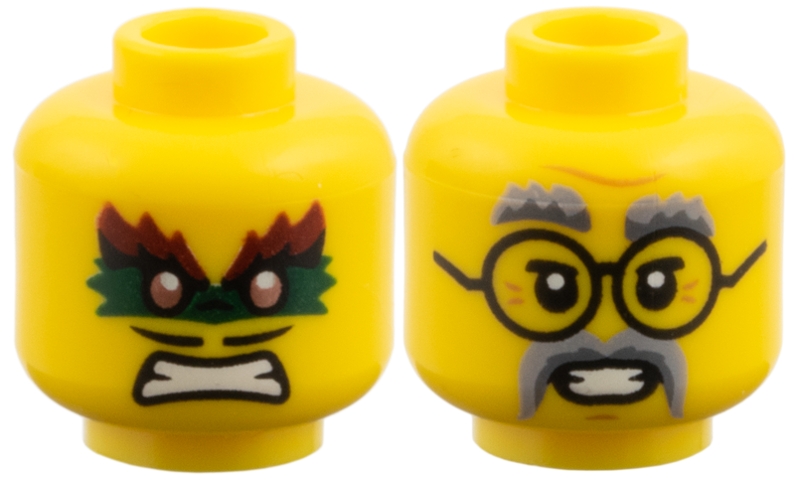Minifigure, Head Dual Sided, Dark Red and Dark Green Eye Paint, Metallic Pink Eyes, Pencil Moustaches / Light Bluish Gray Eyebrows and Moustache, Black Glasses Pattern