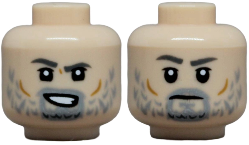 Minifigure, Head Dual Sided Dark Bluish Gray Eyebrows, Light Bluish Gray Beard and Goatee, Dark Orange Cheek Lines, Open Mouth Lopsided Grin with White Teeth / Frown Pattern