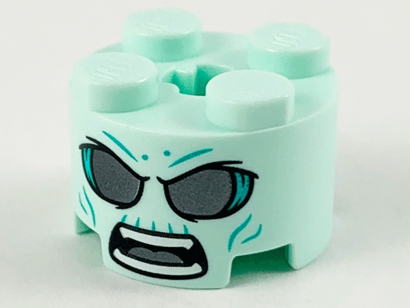 Brick, Round 2 x 2 with Axle Hole with Large Dark Silver Eyes, Dark Turquoise Wrinkles, Angry Open Mouth with Teeth Parted and Tongue Pattern