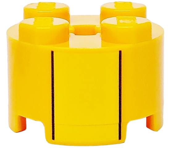 Brick, Round 2 x 2 with Axle Hole with Yellow Stripe and Black Lines Pattern
