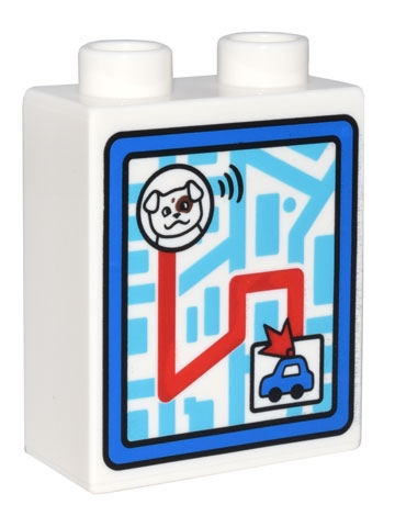 Duplo, Brick 1 x 2 x 2 with Map of Town with Blue Police Car, White Dog, and Red Route Pattern