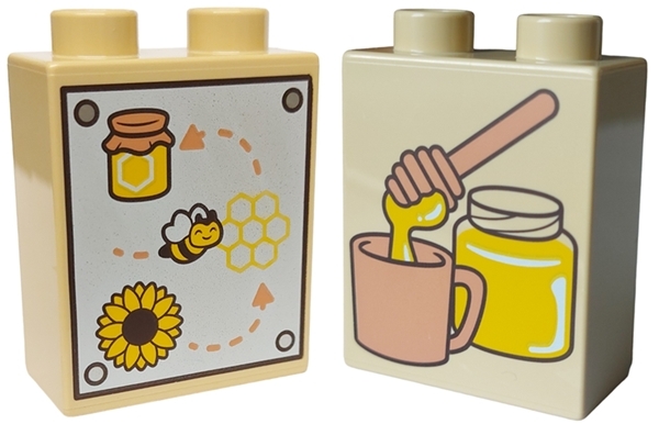Duplo, Brick 1 x 2 x 2 with Bee, Honeycomb and Sunflower / Honey Dipper and Jar Pattern