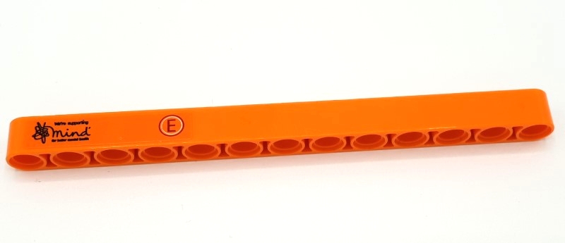 Technic, Liftarm Thick 1 x 13 with Capital Letter E in Red and White Circle and Black 'mind' Logo Pattern Model Left Side (Sticker) - Set 42141 (First Version)