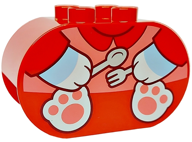Duplo, Brick 2 x 4 x 2 Rounded Ends with Bright Light Blue and White Paws and Hands Holding Silver Fork and Spoon, Coral Top Pattern