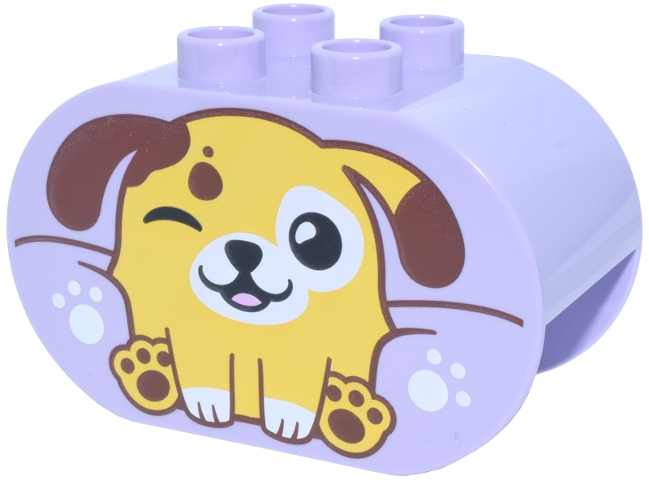 Duplo, Brick 2 x 4 x 2 Rounded Ends with Yellow and Reddish Brown Puppy Dog, White Nose, Eye Patch and Paws, Black Eyes, One Winking and Bright Pink Tongue Pattern