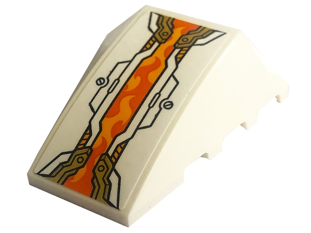 Wedge 4 x 4 Triple Curved No Studs with Gold and White Armor Plates, Screws and Bright Light Orange and Orange Flames Pointing Up Pattern Model Front (Sticker) - Set 80034