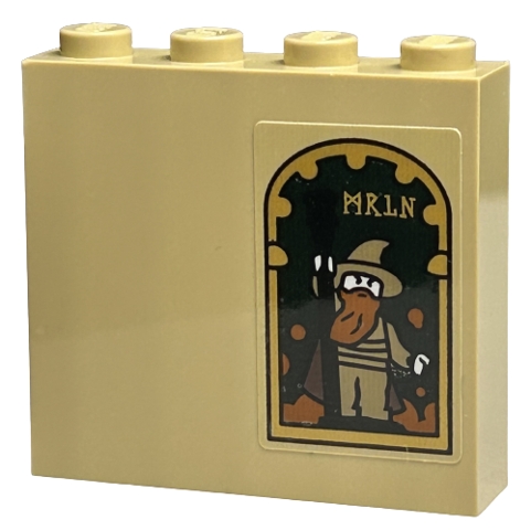 Brick 1 x 4 x 3 with Picture of Wizard with Dark Orange Beard, Black Staff and 'MRLN' in Gold Frame Pattern (Sticker) - Set 40577