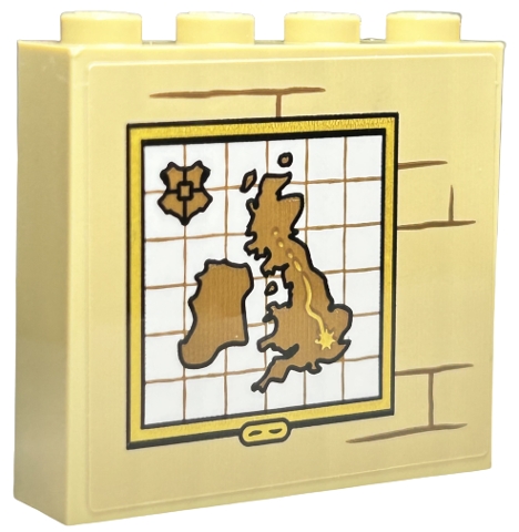 Brick 1 x 4 x 3 with White Map with Medium Nougat UK, Hogwarts Symbol / Shield and Lines with Gold Frame and Mortar Pattern (Sticker) - Set 76423