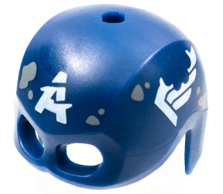 Minifigure, Headgear Helmet Mask, Hole on Top with White Letter A and Wings on Sides, Weathered with Dark Bluish Gray Splotches Pattern