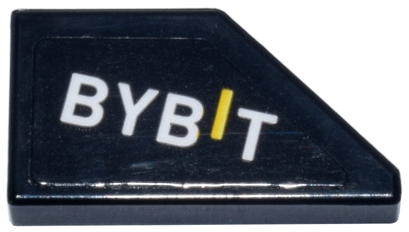 Tile, Modified 1 x 2 Wedge Left with White and Yellow 'BYBIT' Logo Pattern (Sticker) - Set 77243