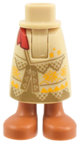 Mini Doll Hips and Skirt Long with Molded Sienna Legs and Feet and Printed Dark Tan Panels and Triangles, Slit in Front, Bright Light Orange Geometric Design, Red Sash Ends Pattern - Thick Hinge