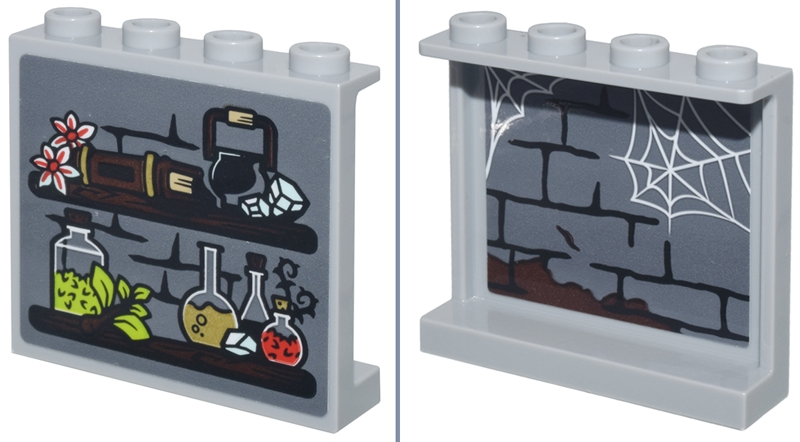 Panel 1 x 4 x 3 with Side Supports - Hollow Studs with Shelves, Potions, Flowers and Book on Outside and Dark Bluish Gray Brick Wall with Black Mortar and White Spider Webs on Inside Pattern (Stickers) - Set 76431