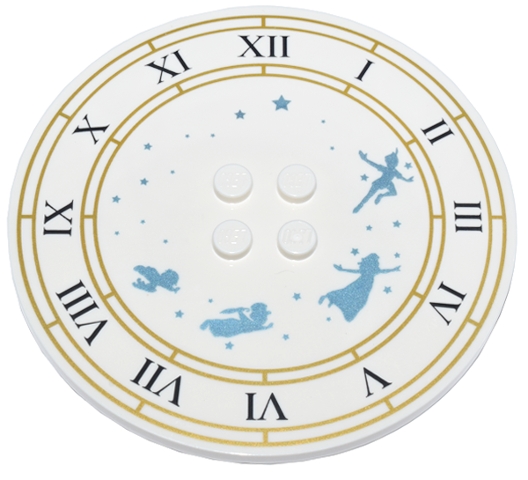 Tile, Round 8 x 8 with 4 Studs in Center with Clock Face, Gold Circles, Black Roman Numerals, Metallic Light Blue Stars and Peter Pan Characters Pattern