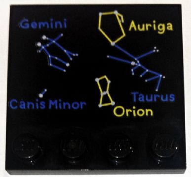 Tile, Modified 4 x 4 with Studs on Edge with Blue and Yellow Constellations, 'Gemini', 'Auriga', 'Canis Minor', 'Taurus', and 'Orion' Pattern