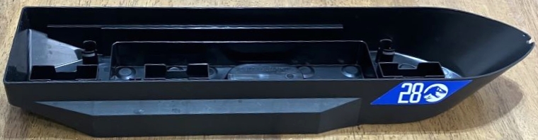 Boat, Hull Unitary 51 x 12 x 6 with Side Bulges, Base with Silver '28' and Jurassic World Logo on Blue Background Pattern on Both Sides and Back (Stickers) - Set 76942