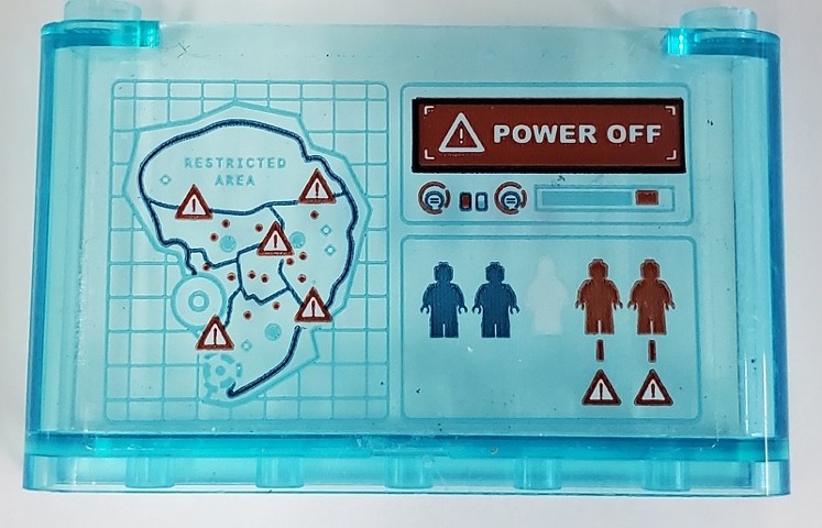 Windscreen 1 x 6 x 3 with 'POWER OFF', Blue and Red Minifigures, Map of Island with 'RESTRICTED AREA' and Warning Triangles Pattern (Sticker) - Set 75939