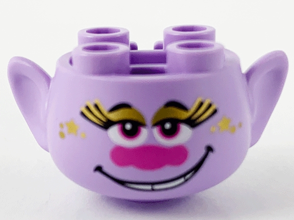 Minifigure, Head, Modified Trolls with Black Eyebrows, Long Eyelashes, Gold Eye Shadow, Stars, and Freckles, Dark Pink Eyes and Nose, Open Mouth Smile with Teeth Pattern