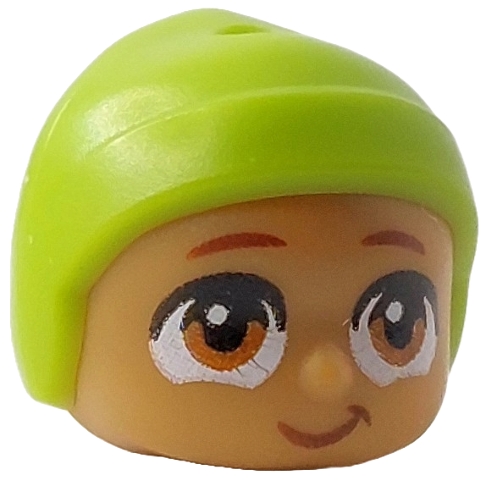 Mini Doll, Head, Modified Baby / Toddler with Molded Lime Cap and Printed Reddish Brown Eyebrows and Dark Orange Eyes, Lopsided Grin Pattern